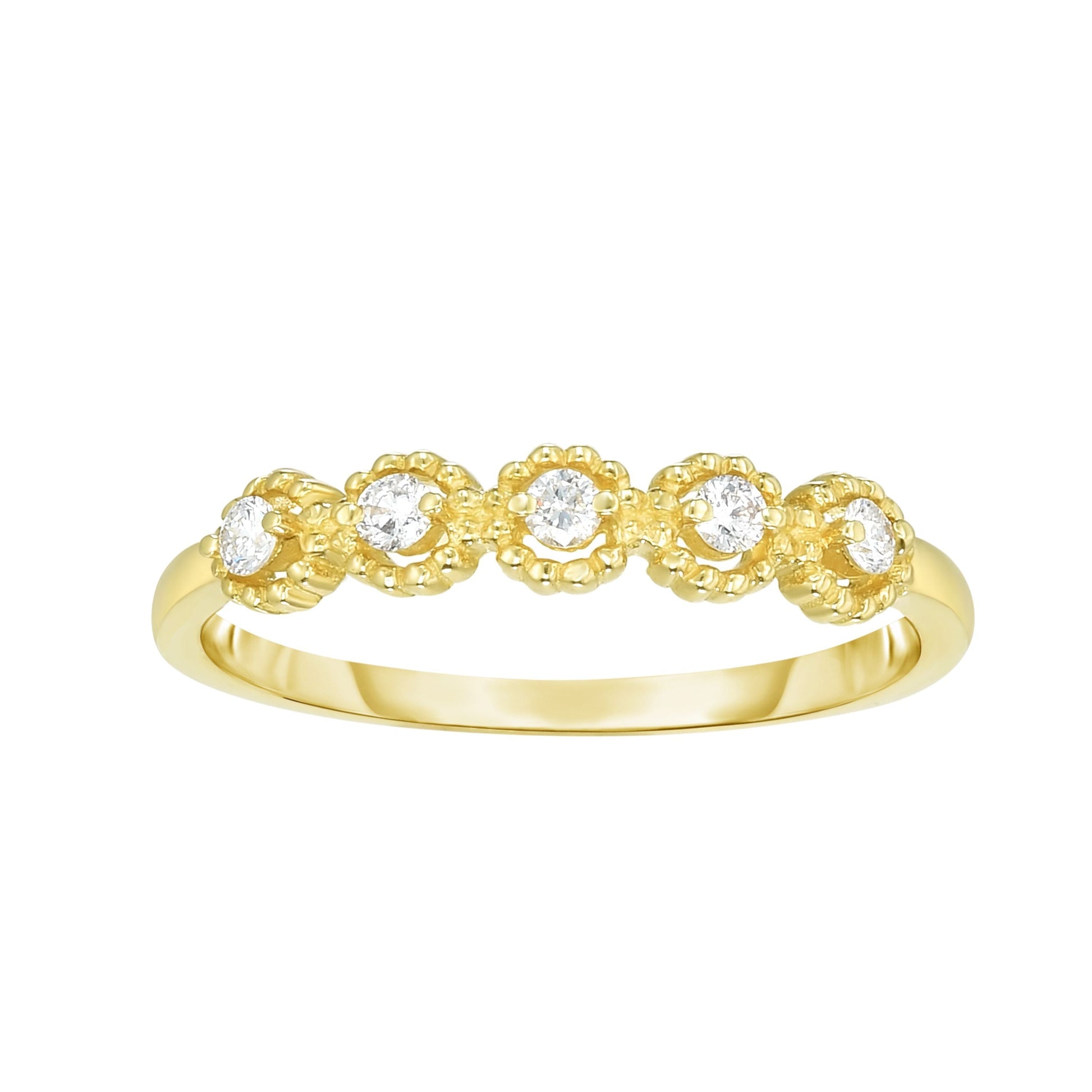 This 14kt gold ring is sizable and features five round diamonds. This ring is versatile enough to be paired with casual or dressy looks.