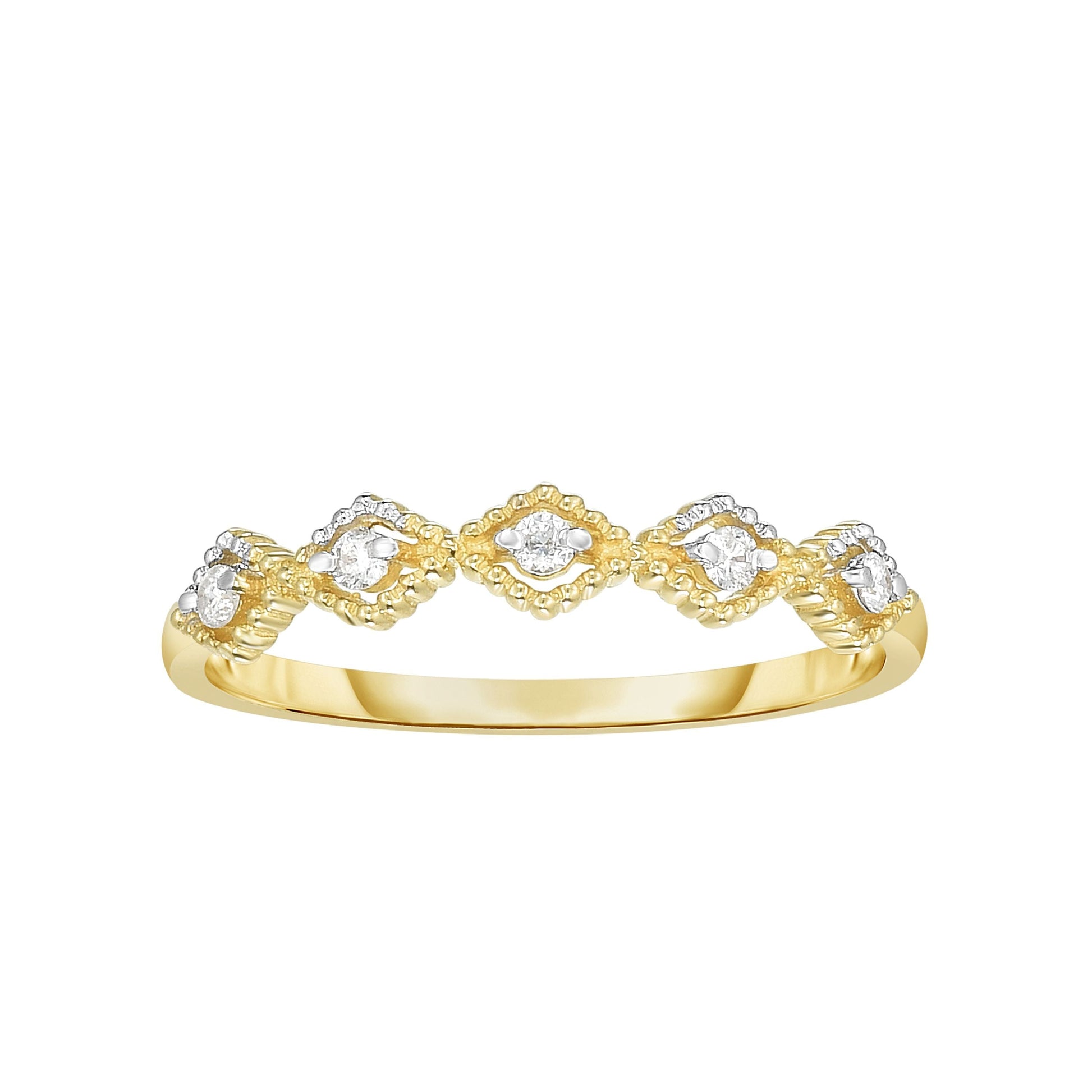 Our 14 karat yellow gold band is fit for a queen. Make her feel like royalty with these five elegant round diamonds around her finger, she deserves it.